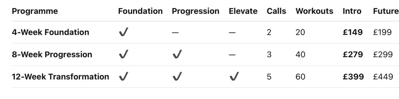 The programme fits around real life and helps you rebuild strength, fitness, energy and confidence without overwhelm.